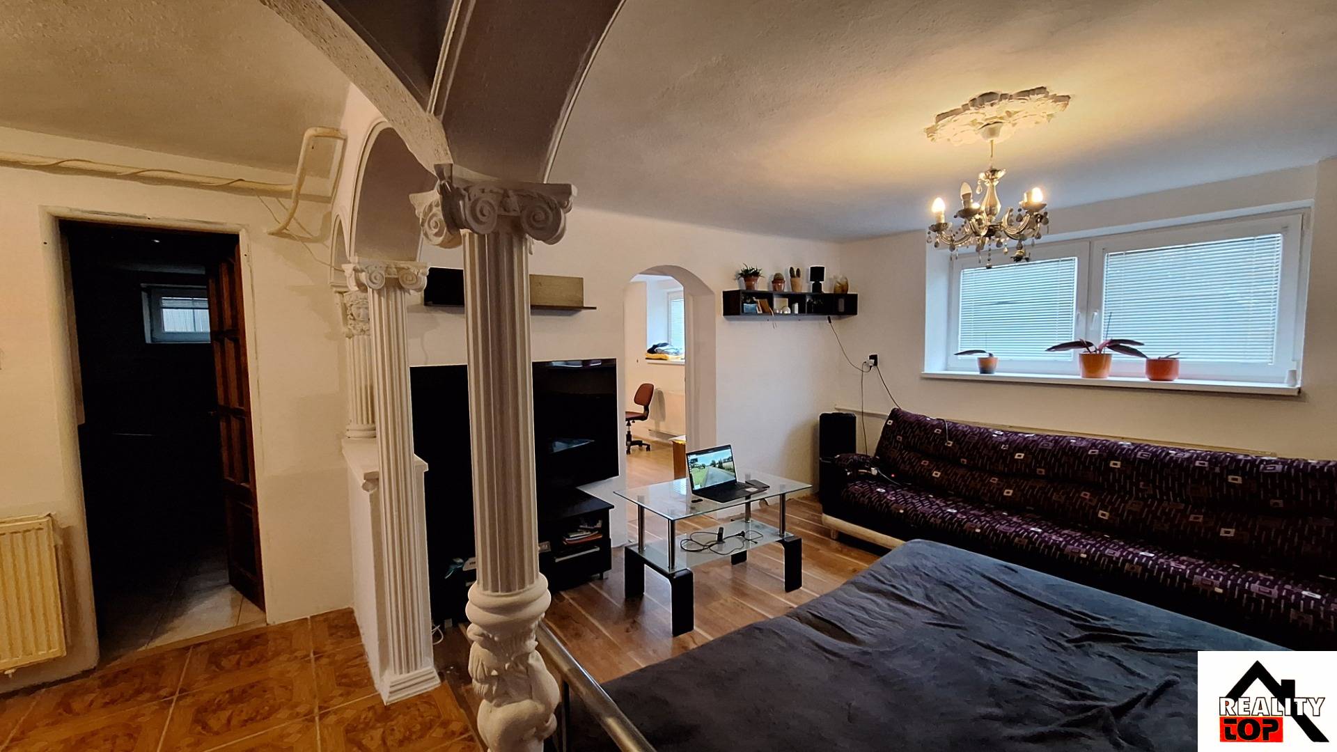 Na patro se dostaneme přes vchod ze dvora (není propojeno s přízemím) kde je kuchyň, obývací pokoj, ložnice, koupelna s WC a spíž.