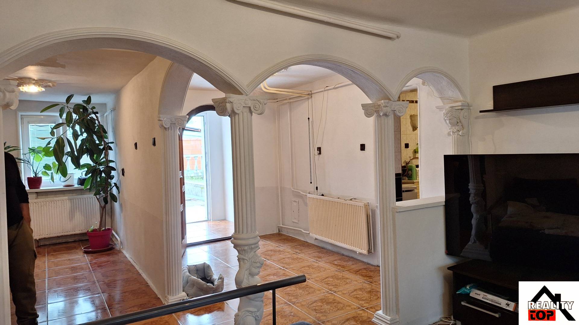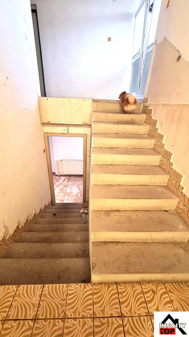 Schody se dostaneme do patra kde je velká hala, ložnice, koupelna a oddělené WC. Tyto místnosti jsou ve fázi rekonstrukce.