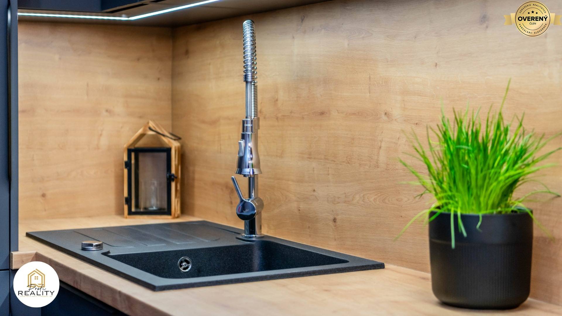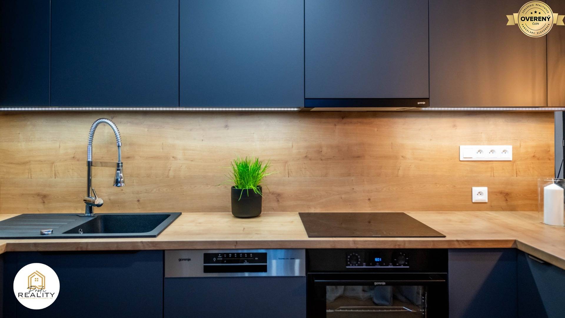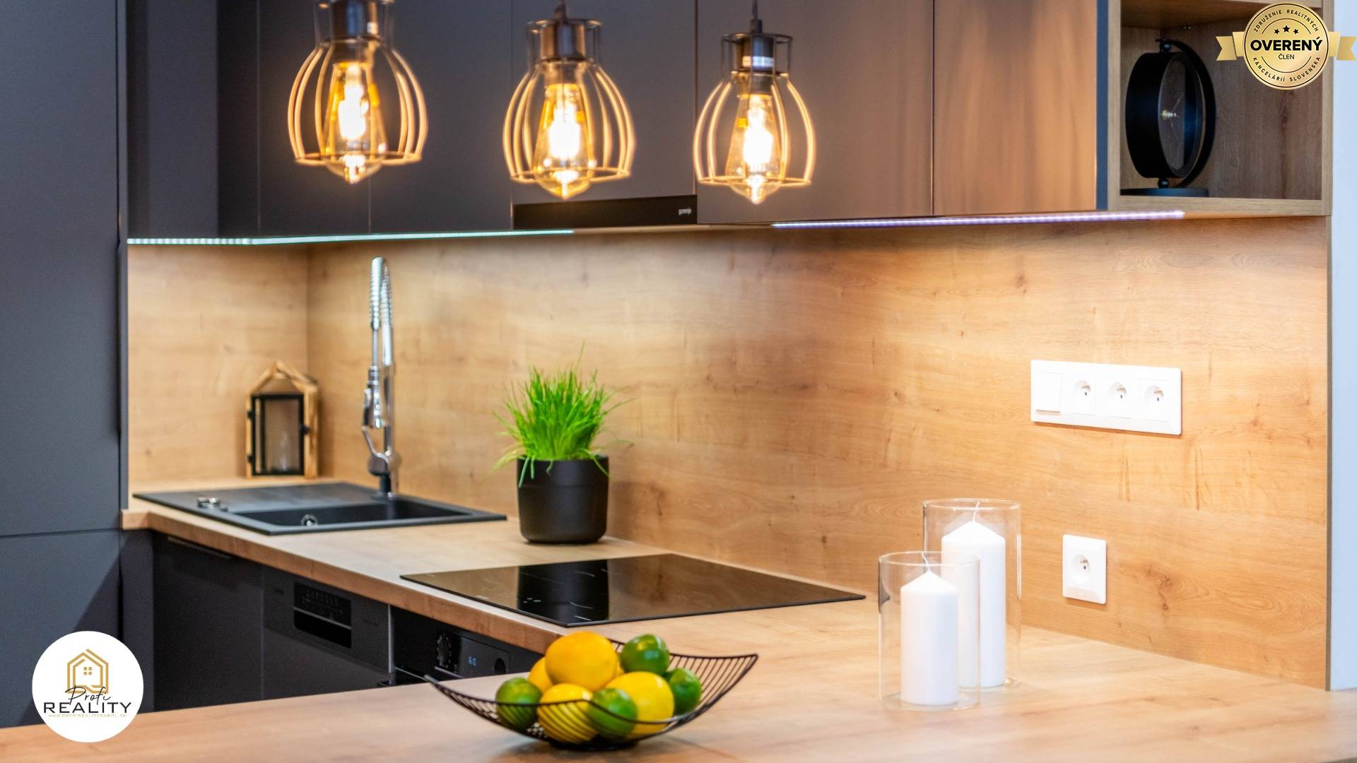 - Byt je vybaven náladovým osvětlením s dálkovým ovládáním v každém pokoji, bezdotykovým zrcadlem, či moderní kuch. linkou s PUSH systémem i LED podsvícením a kompletně vestavěnými spotřebiči - Chladnička s mrazákem, myčka nádobí, indukční varná deska, el. trouba, digestoř s odsáváním do bytové vzduchotechniky, mikrovlna trouba i rychlovarná konvice.