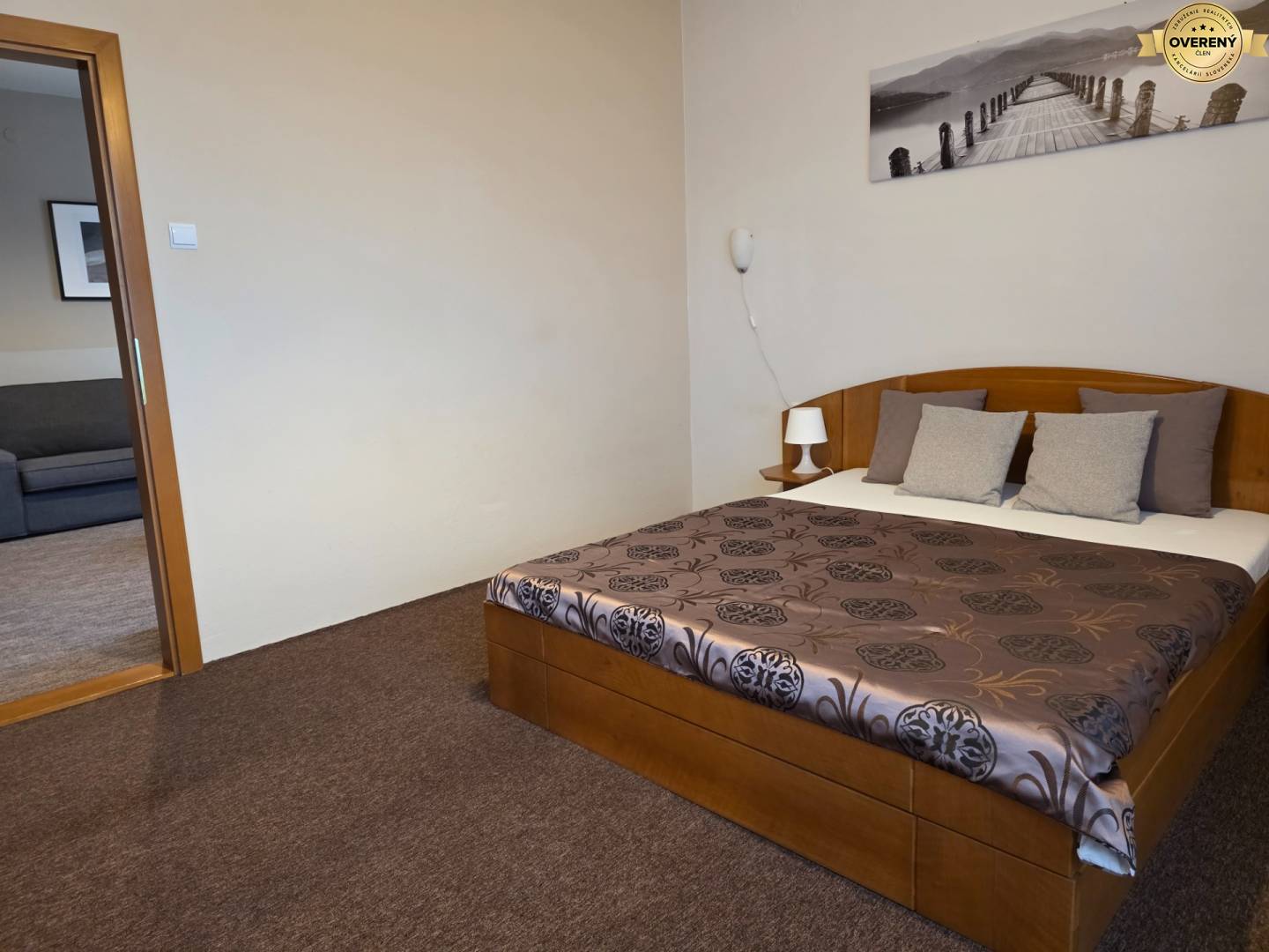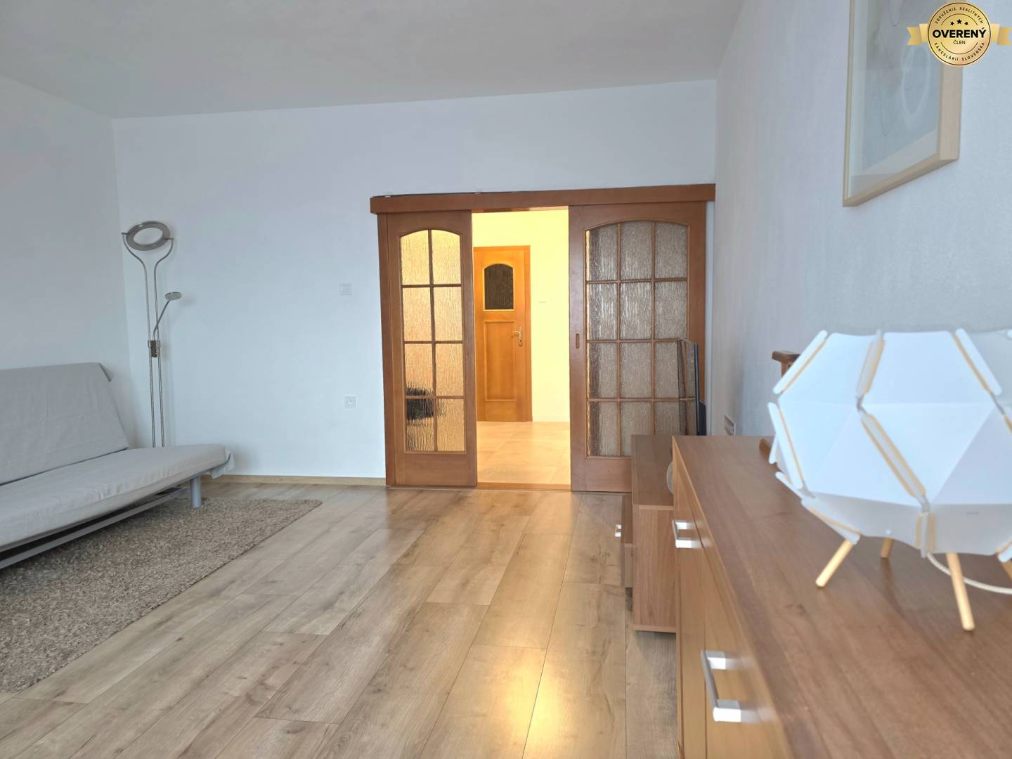 vstupní chodba, samostatná kuchyň se spíží, obývací pokoj, ložnice s manželskou postelí, ložnice předelená na noční čásť s postelí a denní čásť s pohovkou, koupelna se sprchovým koutem a WC.