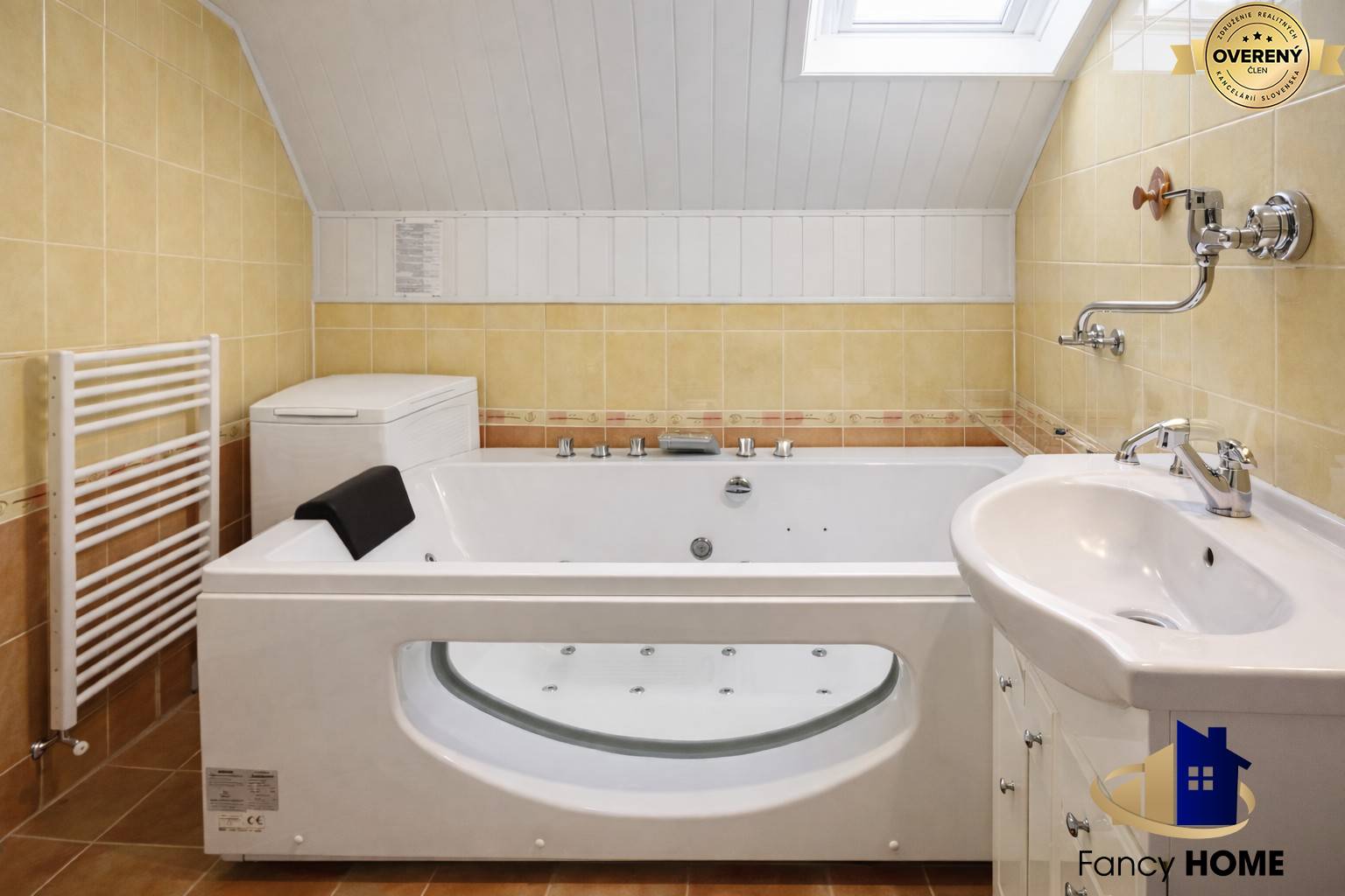 V přízemí se nachází prostorný obývací pokoj s krbem, který vytváří útulnou atmosféru během chladných večerů. Kuchyně je prakticky propojena se spíží a technickou místností, kde je umístěn kondenzační plynový kotel. Na tomto podlaží je také koupelna s rohovou vanou a infrasaunou, stejně jako samostatné WC.
